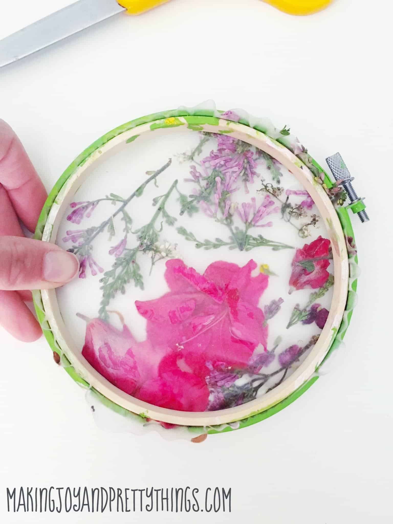 To insert into the embroidery hoop, place your cut flower contact paper on top of the larger hoop part. This should hang out over the edges and that is perfect (as you can see in the photo below).