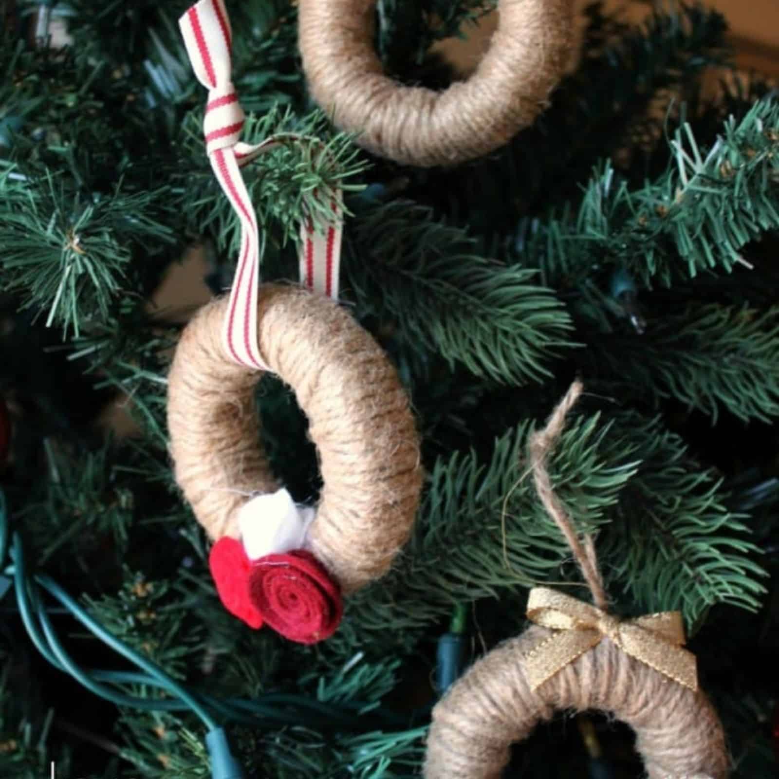 Farmhouse style incorporates texture and natural elements. These cute Christmas tree ornaments are made using jute.