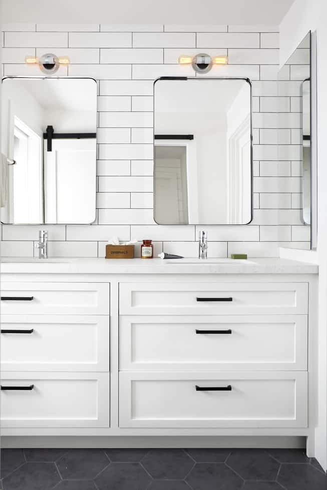 I LOOOVEEE this bathroom from 1111 Light Lane. ย The white subway tile wall with black metal mirrors = perfection!